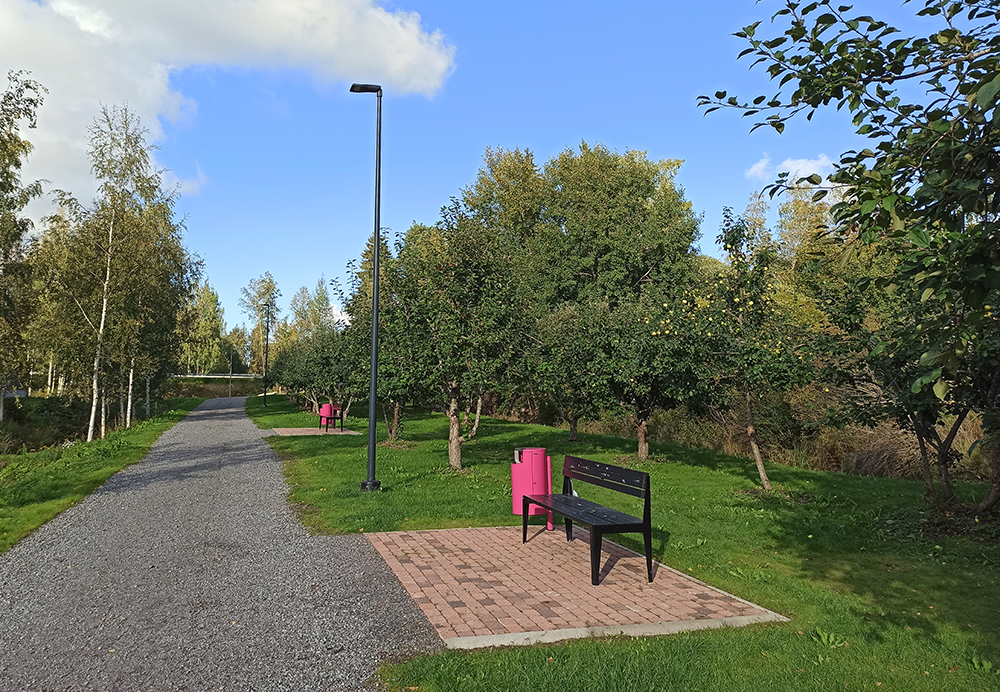 The recreational route continues to the other side of Centrumvägen with a pedestrian underpass. On the other side of the road lies Äppeldalen, a former apple orchard which has been restored as a recreational park. The apple trees blossom in the spring and you are welcome to taste the sweet apples when they are ripe for picking.