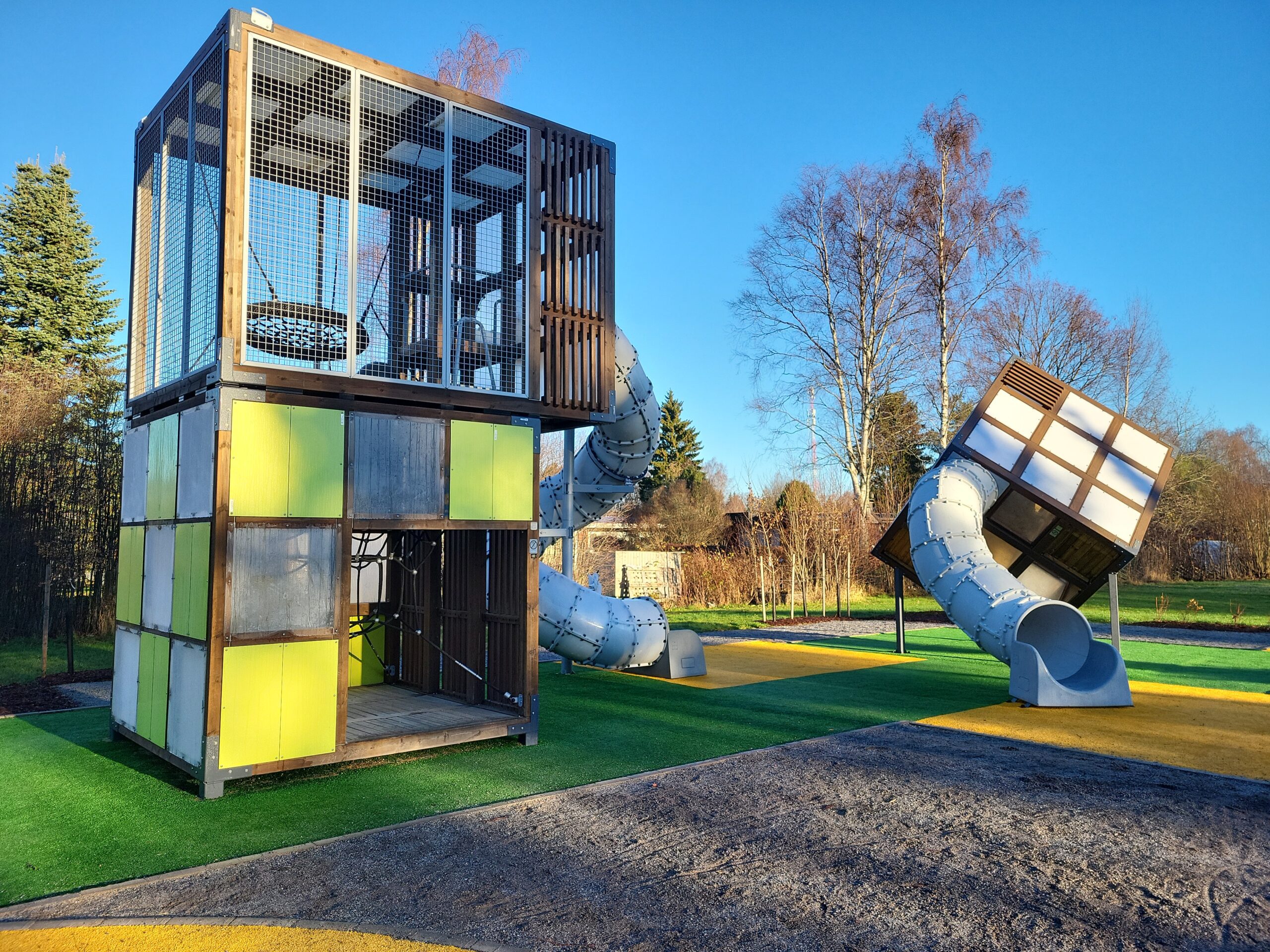 The first stop along the route is Olav playground. The playground has quite exceptional outdoor playing equipment. Climbing cubes are perfect for 10–13 years old and another rare speciality is a carousel with a climbing net.